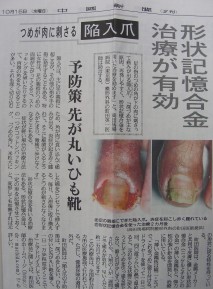 琉球新報 夕刊「爪が肉に刺さる 陥入爪」 足の親指に多く炎症も 形状記憶合金治療で治療 町田が紹介されました。 2008年9月14日発行