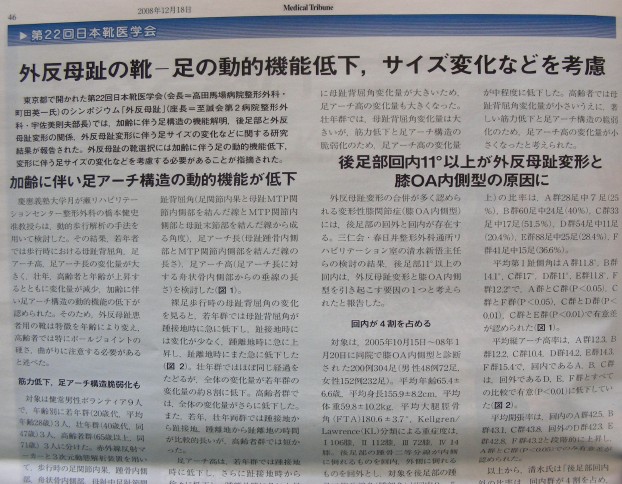 Medical Tribune (メディカルトリビューン 医学新聞)第22回日本靴医学会 「外反母趾の靴....」 町田が主催した学会が紹介されました。 2008年11月15日発行