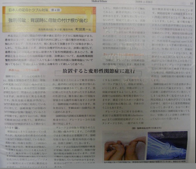 Medical Tribune (メディカルトリビューン 医学新聞)日本人の足のトラブル対策 第4回 「強剛母趾 : 背屈時に母趾の付け根が痛む」 町田が紹介されました。 強剛母趾とは 2009年2月19日発行