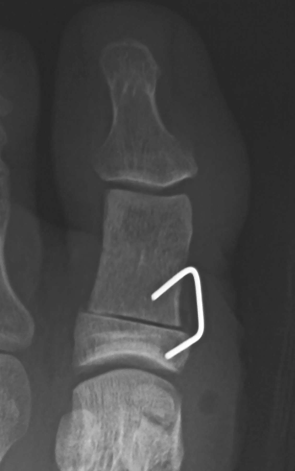 近位骨片の固定に用いた 2mm K wire の残りを用いて、 母趾の回旋を行うためのワイヤ、ジョイ・スティック(joy stick)を刺入する。骨の軟らかい切除部を避けて、骨皮質の硬い部分から骨頭を貫くまで入れる。ワイヤが長過ぎての先端が第2中足骨に接触しないように注意する。母趾の爪の面を矯正するので、ジョイ・スティックは爪と平行に挿入し、第1中足骨の回旋を矯正した時に足底面に平行になる。